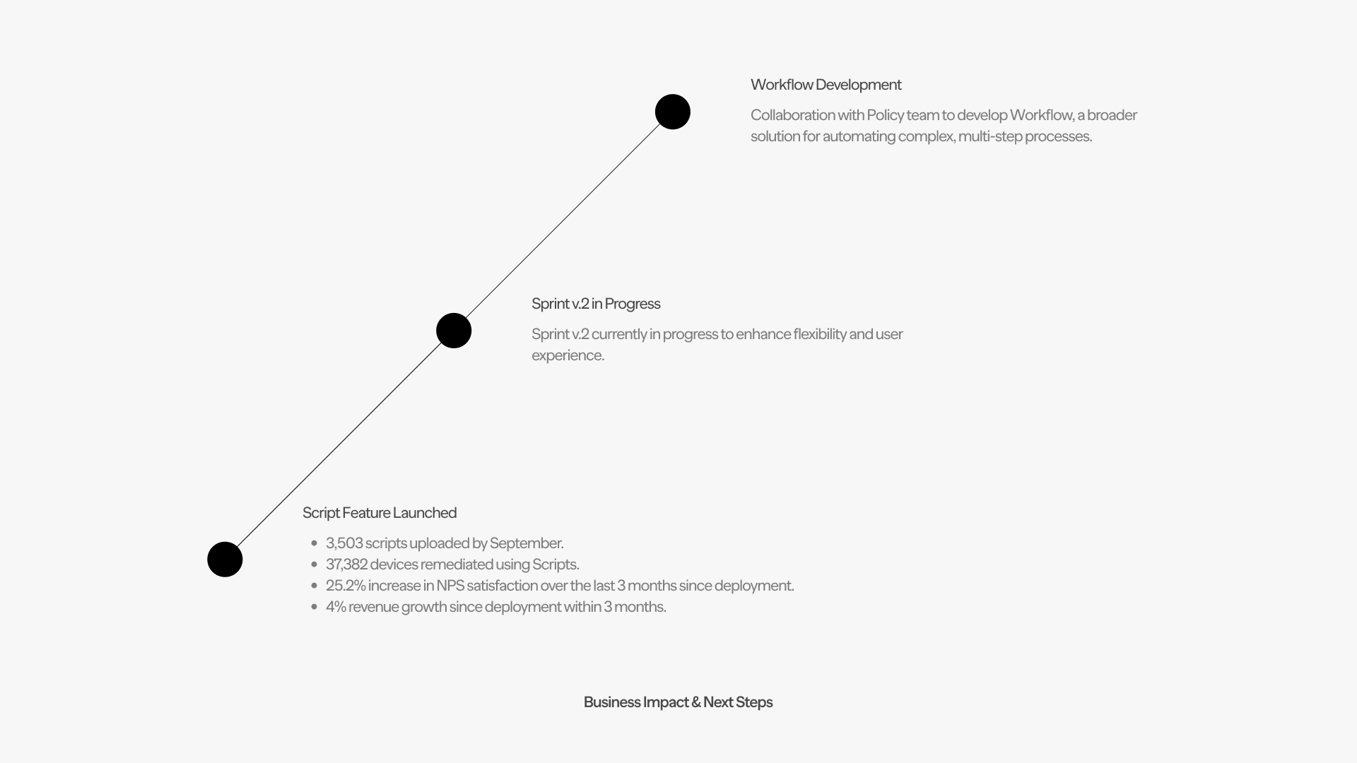 Initially, we considered building a robust platform called Workflow, designed to automate multi step, tailored processes. However, the scope of such a project within a three month timeline posed high risks and resource challenges. To address this gap efficiently, I proposed an MVP solution: Scripts. This feature would allow admins to create, upload, and deploy custom PowerShell scripts, solving problems Recommended Actions couldn’t address while validating the concept for future expansion.